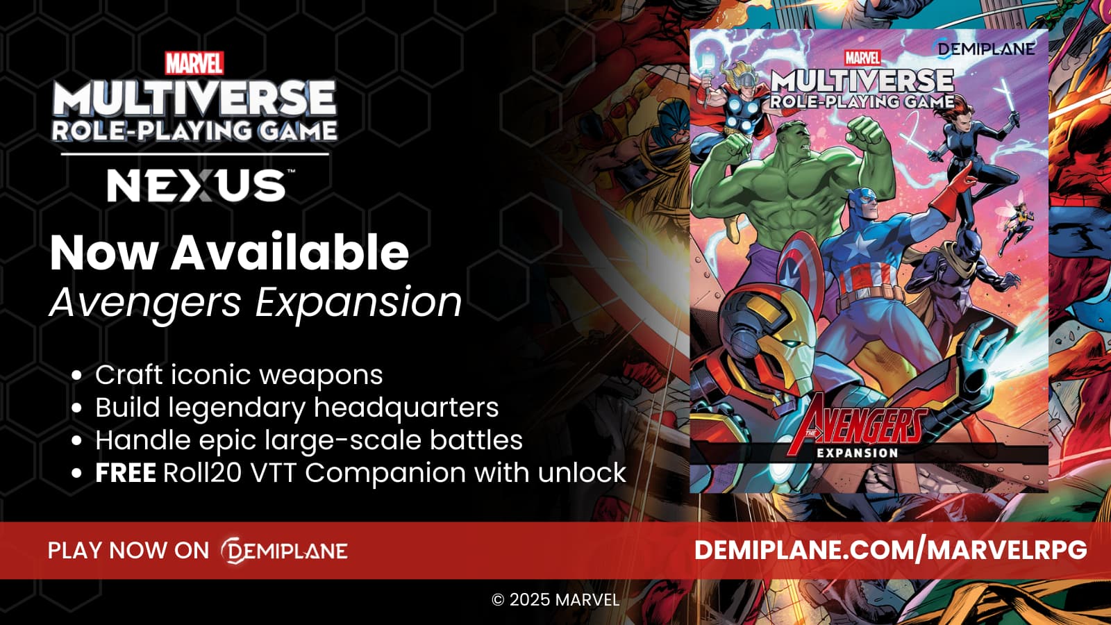 The MARVEL MULTIVERSE ROLE-PLAYING GAME: AVENGERS EXPANSION is the next major tabletop expansion for the Marvel Multiverse Role-Playing Game, featuring all-new playable locations, characters, and legendary equipment to create an adventure unlike any other.