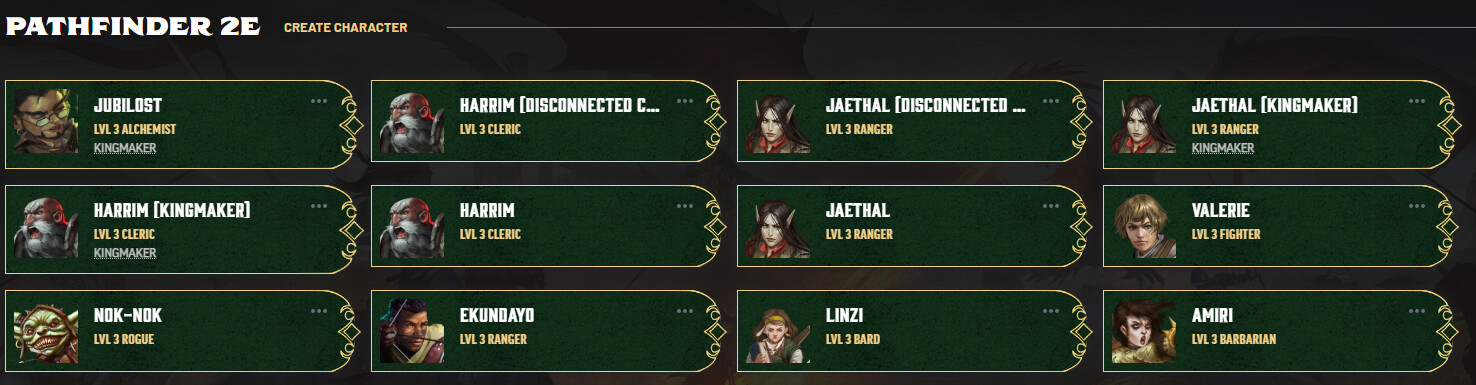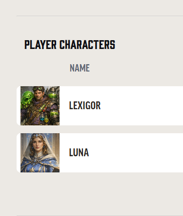 The third row on the “characters” page with the campaign listing is nice, but the vertical size of characters that aren’t in campaigns shouldn’t be different from the size of those that are… all these entries should have the same vertical size: