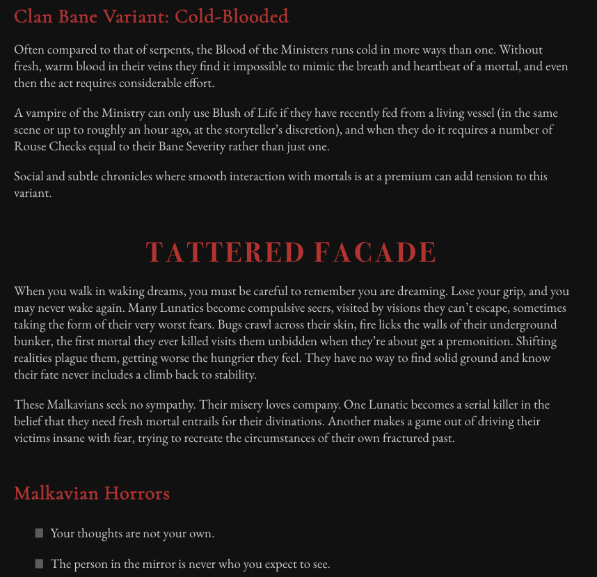 When you select The Ministry Clan from the Game Rules, and you are presented with descriptions of the clan from each of the sourcebooks, the Tattered Facade entry is actually for the Malkavians.