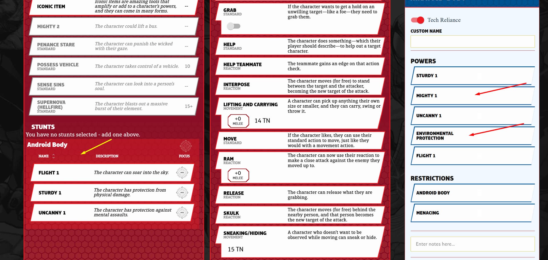 I have an issue with an Iconic Item, but it is a bit complex. I built a character with High-Tech: Android Origin and added the Spirit of Vengeance Origin on top of it. Built an Iconic Item with Sturdy 1, Mighty 1, Uncanny 1, Flight, and Environmental Protection. I then bought the Spirit of Vengeance required powers, which Include Environmental Protection and Mighty 1 that I already purchased. Regardless of whether I have the Alternate Form (Ghost Rider) toggled on or off, the Environmental Protection and Mighty 1 are not showing up on the Iconic Item.