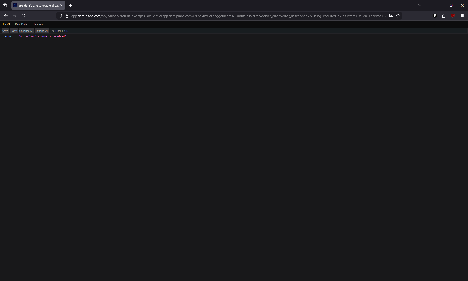 I try to view my character then login using the Roll20 sign in method but I keep getting this message