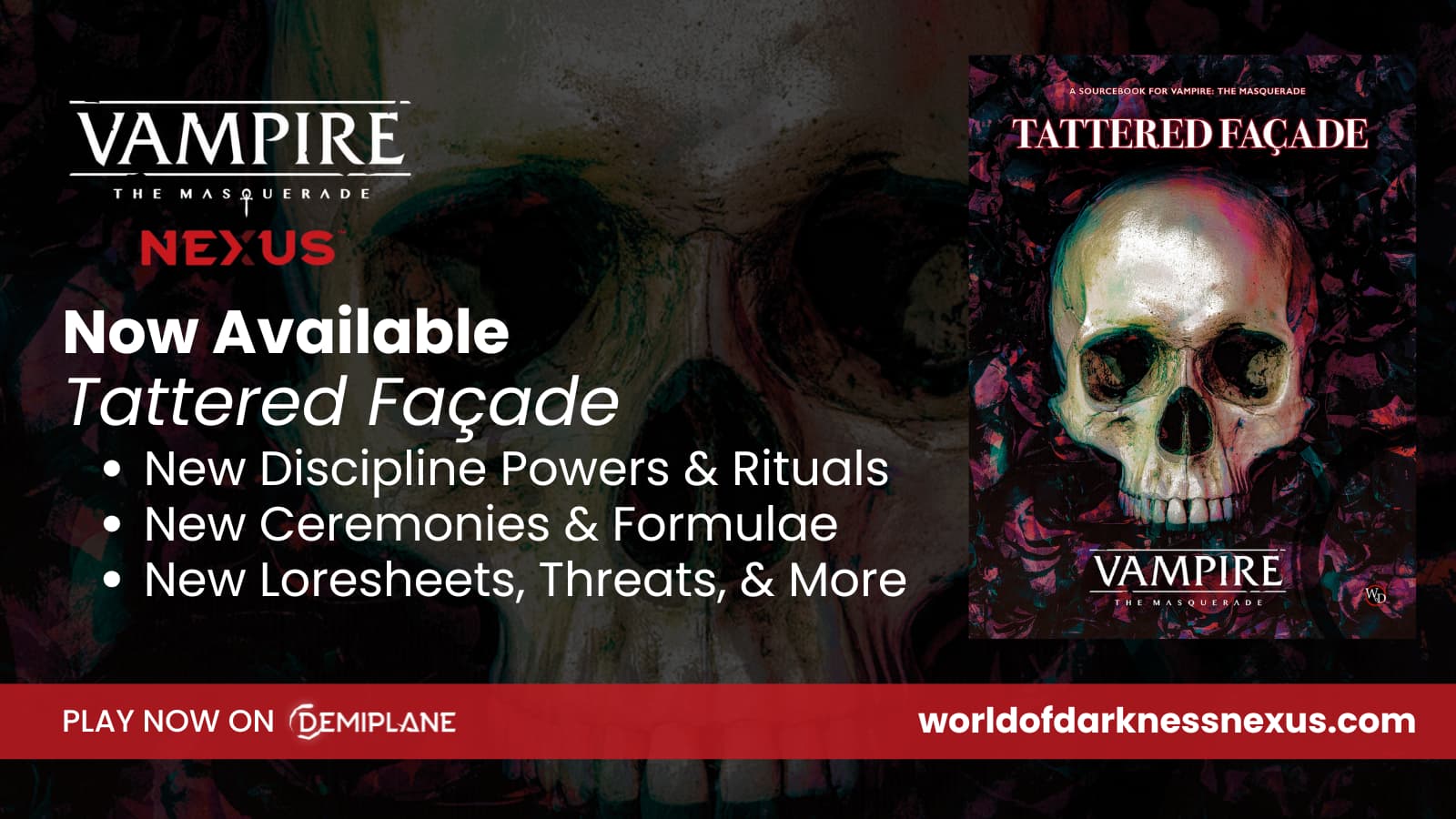 Behind the Tattered Façade lie many shadows, and all of them conceal darker secrets still, from the Masquerade Machine itself to the worse things waiting for it to fail. This book details the ecology and deepens the horror of Vampire: The Masquerade by working with the game systems to choose a shade of darkness: body horror, Gothic horror, folk horror, or even cosmic horror.