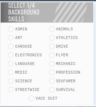 There is a problem in the Traveller character creator where for background skills it says one has a been selected but none is I don’t know it was from clicking and unclicking to fast for changing background skills but it is bit of a problem because I starting to get annoyed from it being on two of my characters all ready but one character is delete all ready thinking it was a small bug but I think not now.
