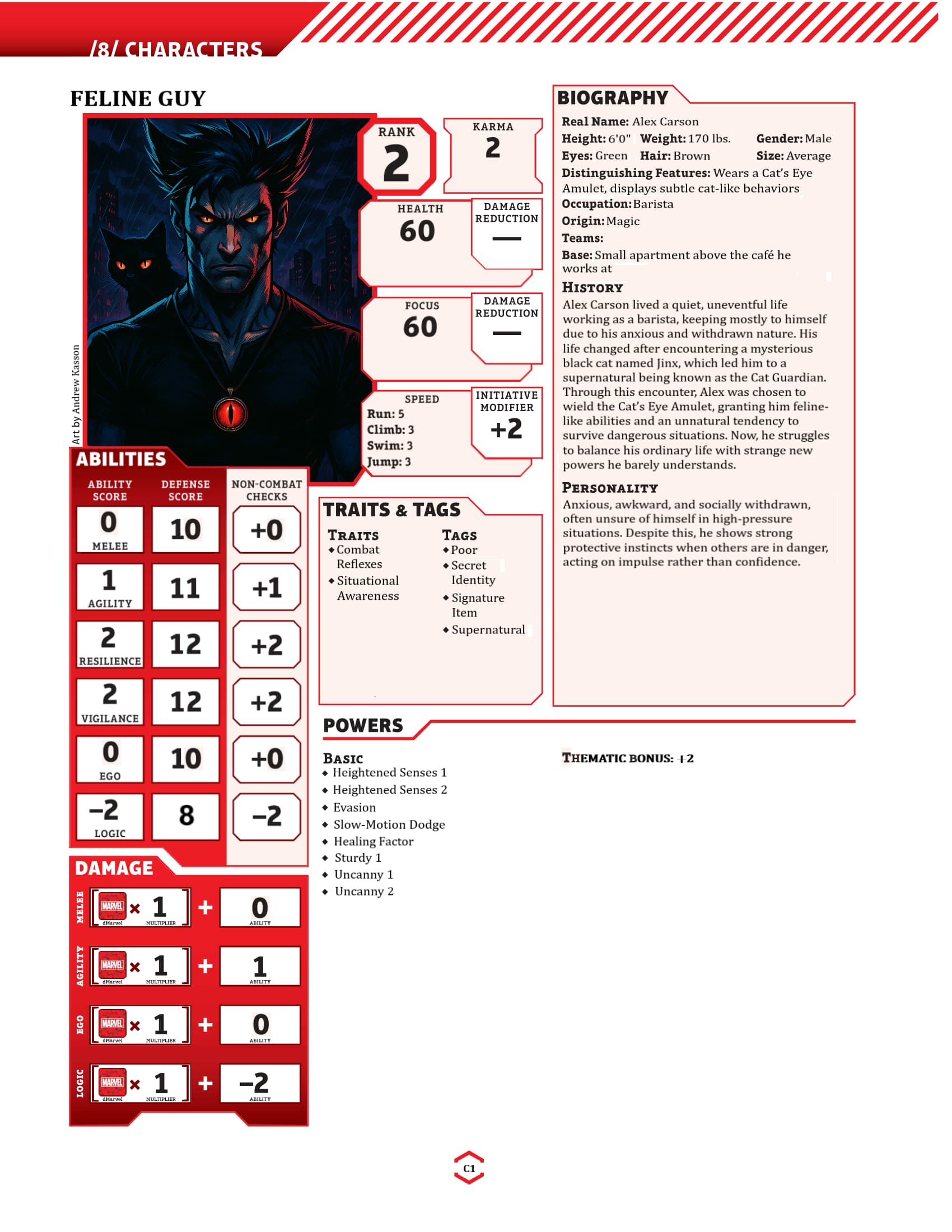 I’m starting my first campaign this weekend. And I could use a little help with my character creation. I’m using my own custom characters and campaign. I’m in the process of creating their character sheets right now but i’m a little lost. Can someone with experience please look over my character sheet that I provided and let me know if I did everything right. I think I might be missing something. The first character that i’m creating is: Feline Guy. He is a low-level, rank 2 character. If anything looks off or missing, please let me know. It will be much appreciated! Thanks;)
