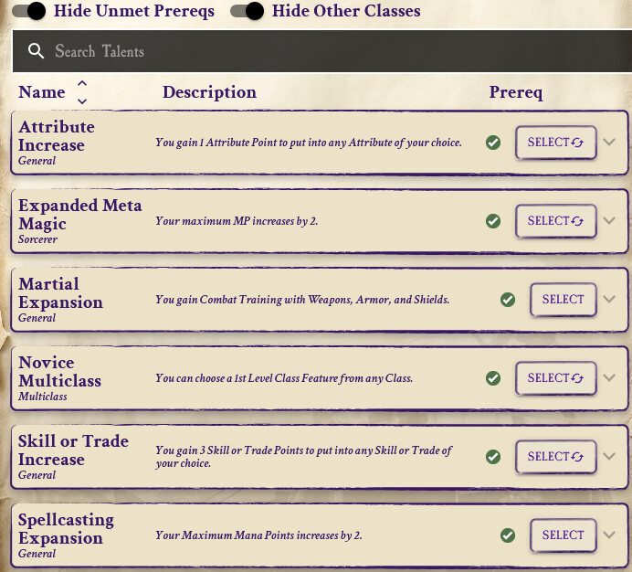 - include the Class Talents for that Class as listed in the Rules (which are not currently available) ; and