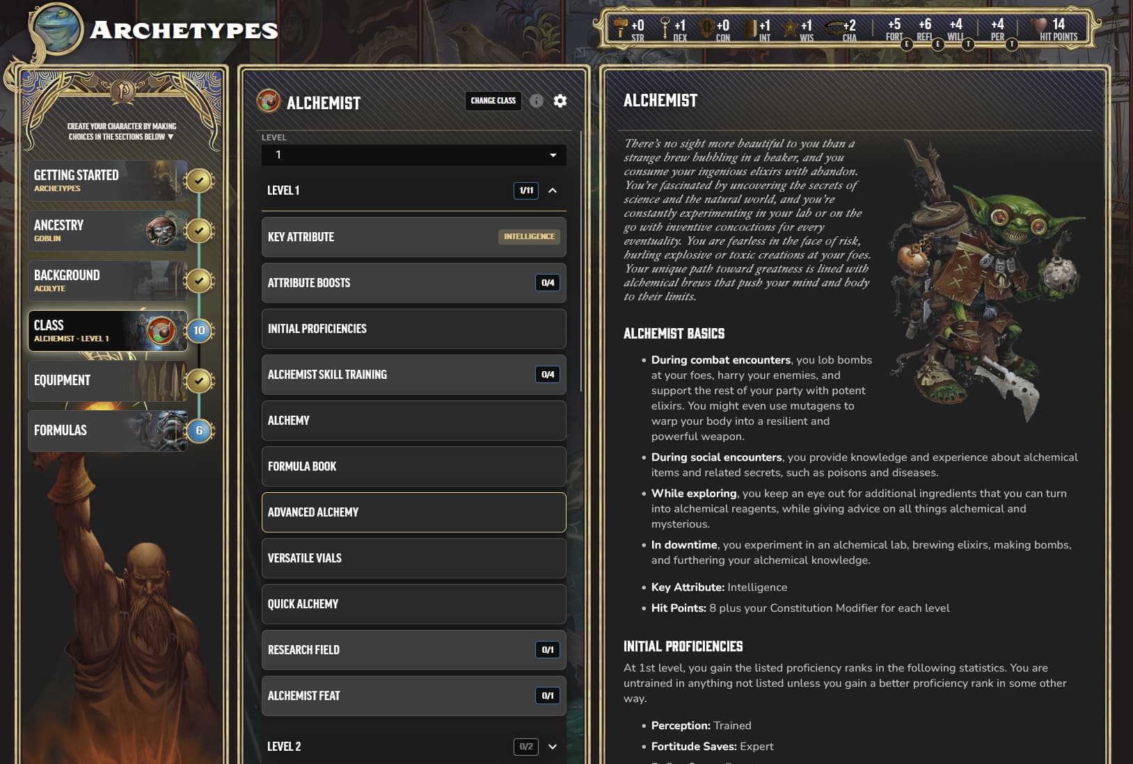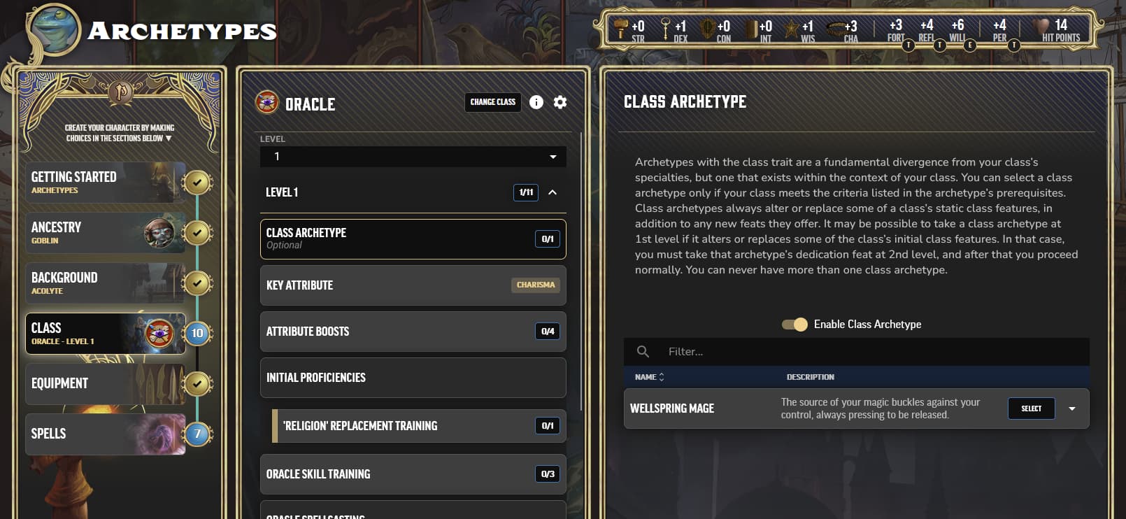 Hey edgarkraven. I think I figured out the problem you’re running into. If you’re looking at Class Archetypes you’re correct in thinking there’s only one available. This is because a Class Archetype is a specifically different way to play that class and not all classes even have one yet. I’m going to post two screenshots below, the first is showing the Class Archetype available for Oracle and the second will show that Alchemist doesn’t even get the option to select a Class Archetype.