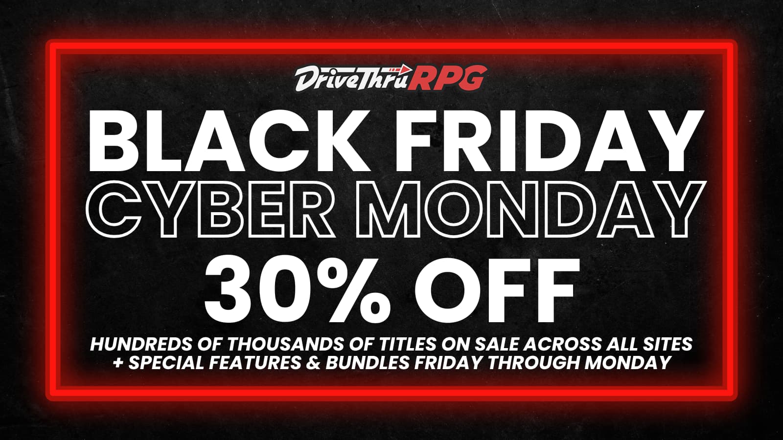 Save 30% across all DriveThru Sites and the Roll20 Marketplace on thousands of titles with deep discount doorbusters on Black Friday through Cyber Monday!