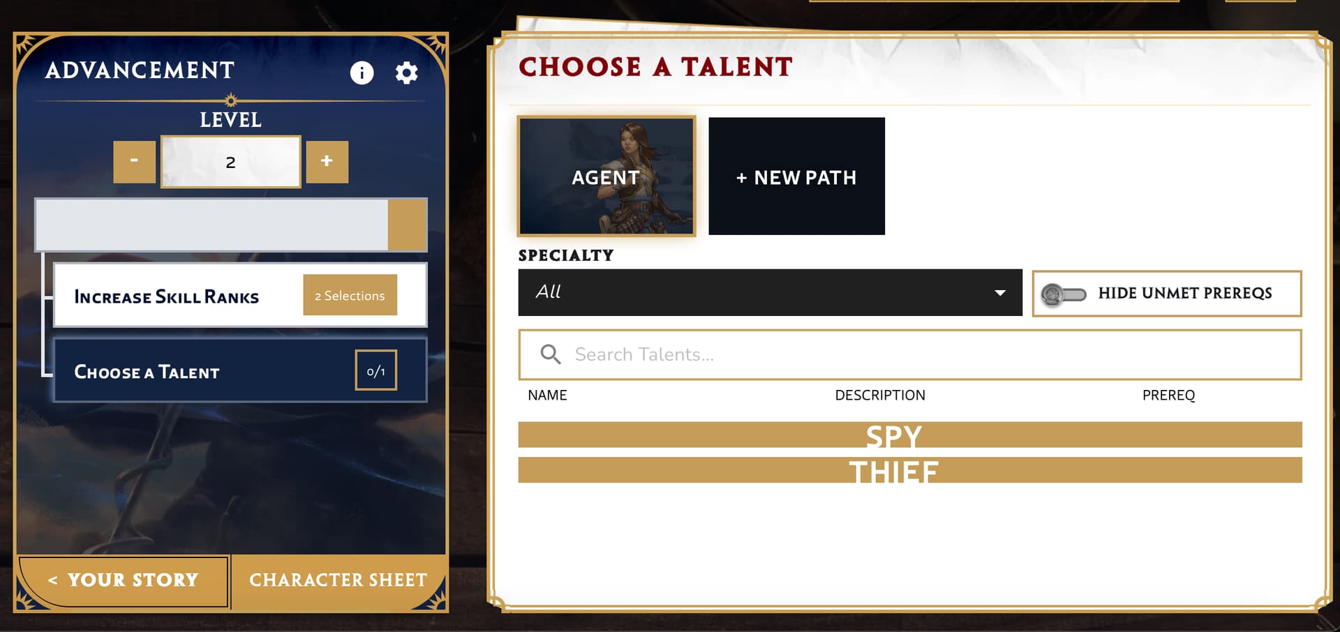 The sheet I was using must have been outdated. When adding the Agent path a second time, all talents became visible. I did have to recreate the character in order to fully fix the issue.