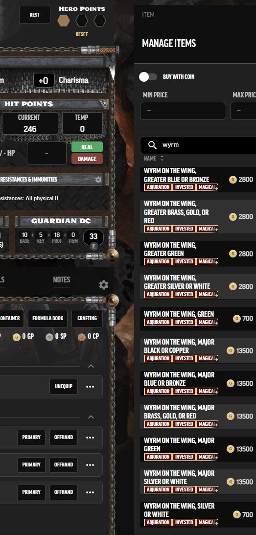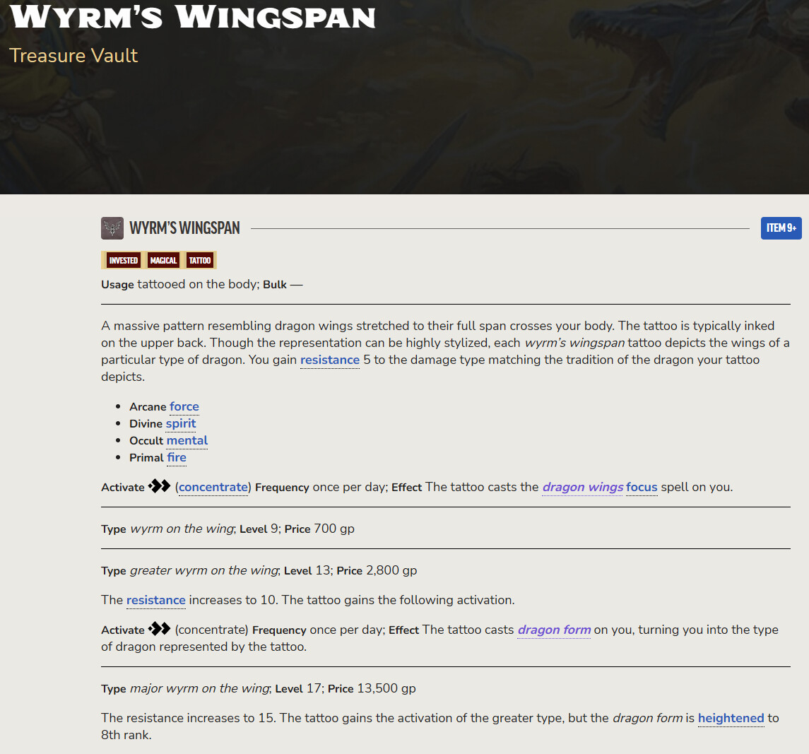 For some reason, I have the legacy options disabled but when I search for the remastered Wyrm’s Wingspan tattoo item in the equipment all category from the character sheet, it doesn’t show up in the listing… instead I get the legacy versions, Wyrm on the Wing (chromatic/metal dragon options) instead of the Wyrm’s Wingspan (magic tradition options):