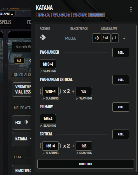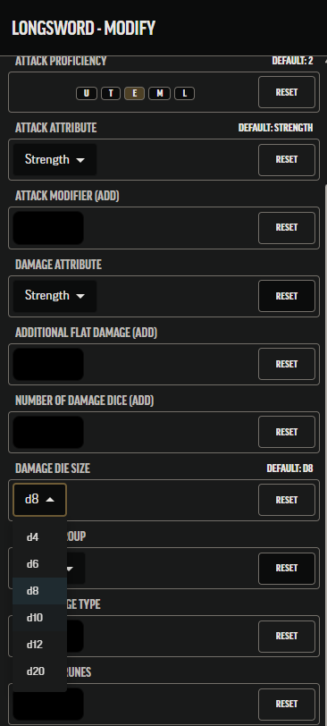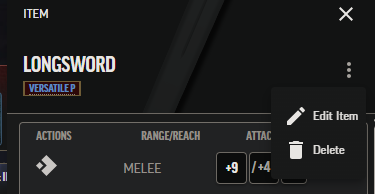 To manually edit the damage die, click on the weapon in your inventory, then go to the ellipses menu: