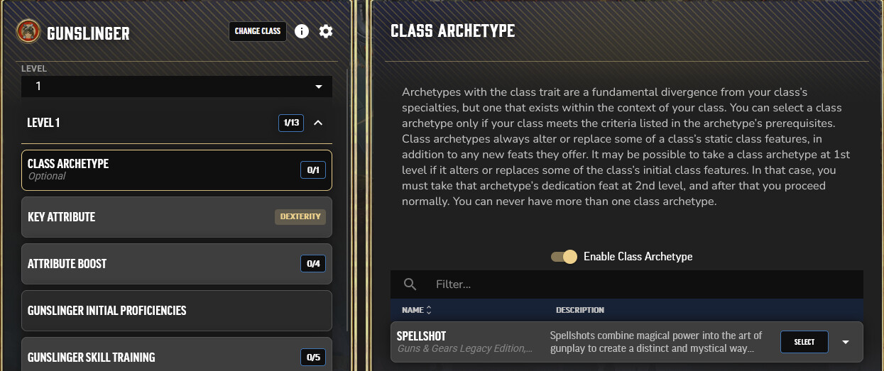 Thanks for letting us know about this. Looking at a gunslinger on my end I see that Way of the Spellshot is listed as a Class Archetype that you can pick at level one. What are you seeing instead? Can you go into a little more detail about the trouble you’re having?